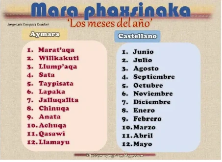 This is a 13 * 28 calendar. Both Quechua and Aymara names are given. However, this is not fully confirmed to be official.