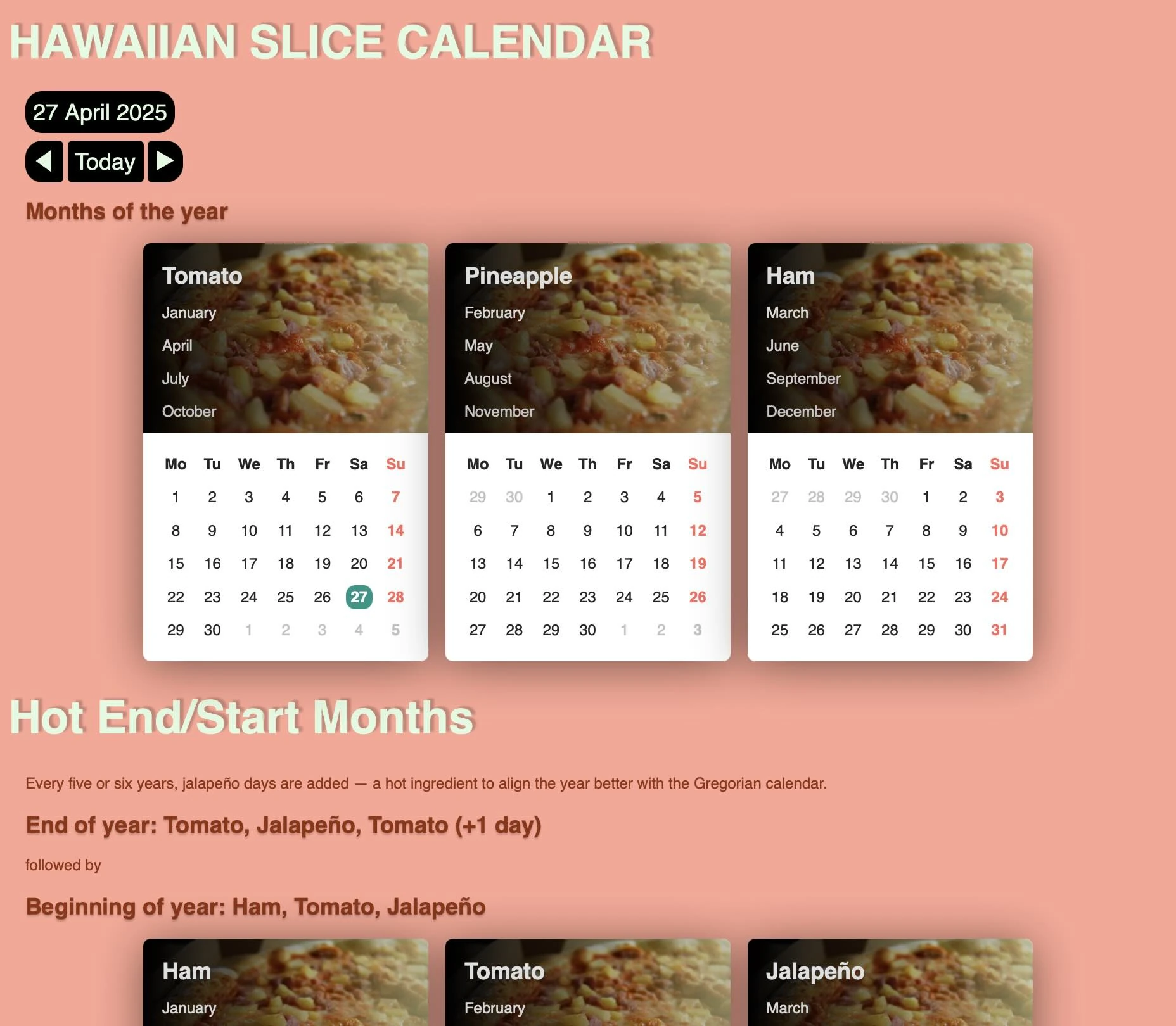 January is a Ham month starting on a Friday and has one more day than usual. February is a Tomato month starting Monday with one additional day.