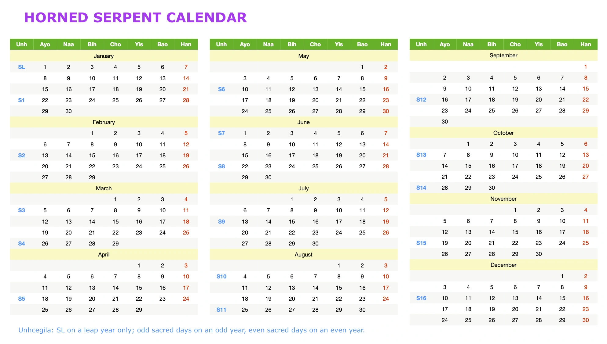The Horned Serpent calendar generally follows the Gregorian calendar except that it has a more regular structure. The calendar is based on a two-year cycle which is why even and odd years are different.