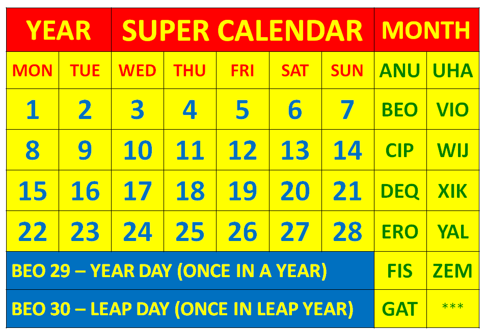 The Super Calendar brings with it a new week concept. All months except the second month have 4 weeks exactly. The second month has 4 weeks plus additional days. These additional days are known as Superdays. These days are added at the end of the last week of the second month which is called Superweek.