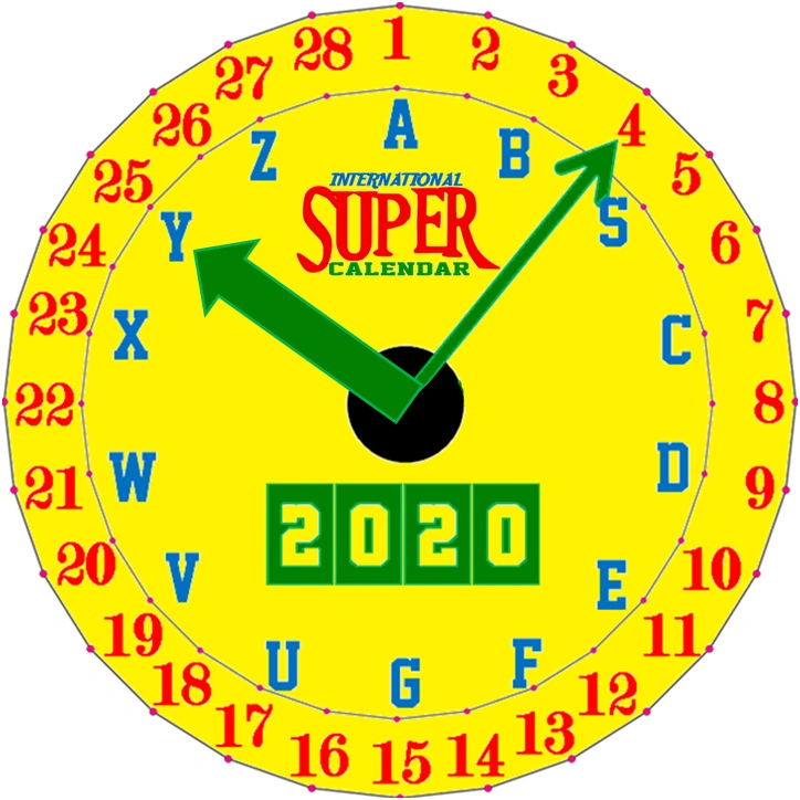 Super Calendar dates can be represented by an altered analog clock face. If one imagines the superdays as an imaginary month, then the calendar has 14 months. These month divisions are enough to place in a 28-division clock. Each division represents one of the 28 days. The days are shown by the long hand and months by the short hand.