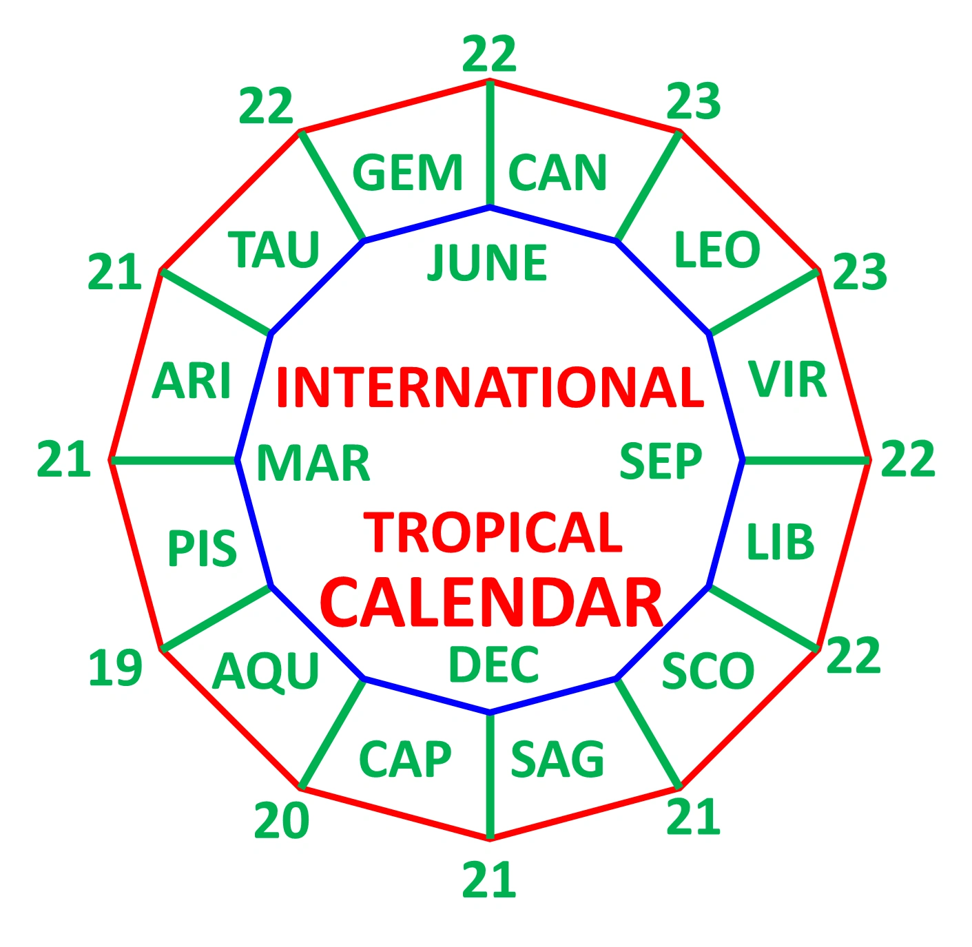 The International Tropical Calendar (ITC) is the proposed tropical calendar by Dr. Vam based on Western Zodiac (Previously Astronomy) with the dates being permanently synchronized to the Gregorian Calendar. Until now, the Gregorian calendar is modernized using tropical year concept (365.2425 days per year), but the equinoxes and solstices occur in the middle of the months. This new tropical calendar aligns with the tropical astrological months.