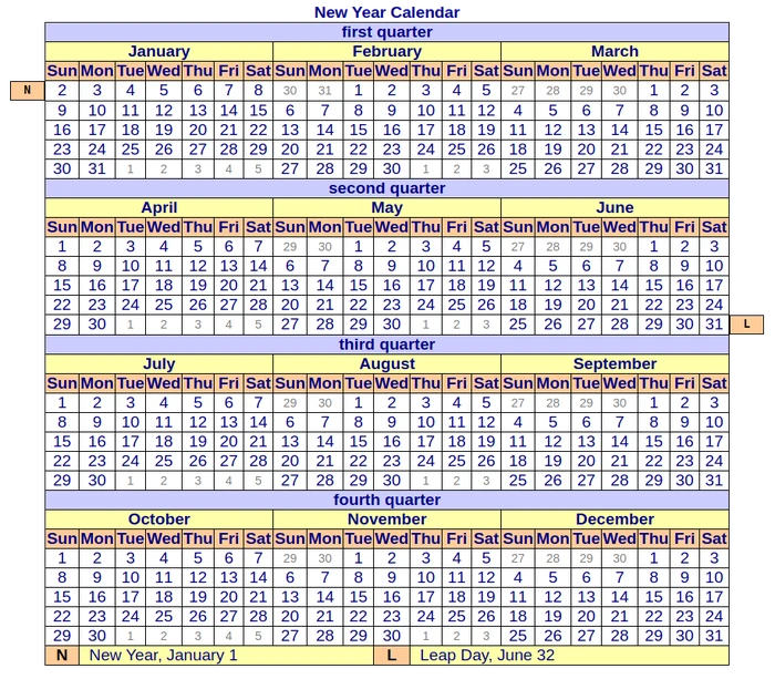 The New Year Calendar has four equal quarters not counting the weekfree days. Each quarter has 91 days, 13 weeks and 3 months. The three months have 30, 30 and 31 days respectively. The weekfree days are New Year and Leap Day. These days have a date and so are part of the calendar.