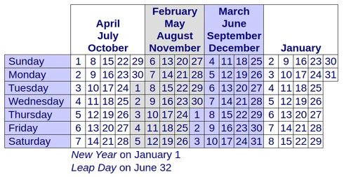 For an equal distribution of weekfree days Leap Day is placed in the middle of the year. Leap Day is on June 32. So in ordinary years June has 31 days, but in leap years it has 32 days.