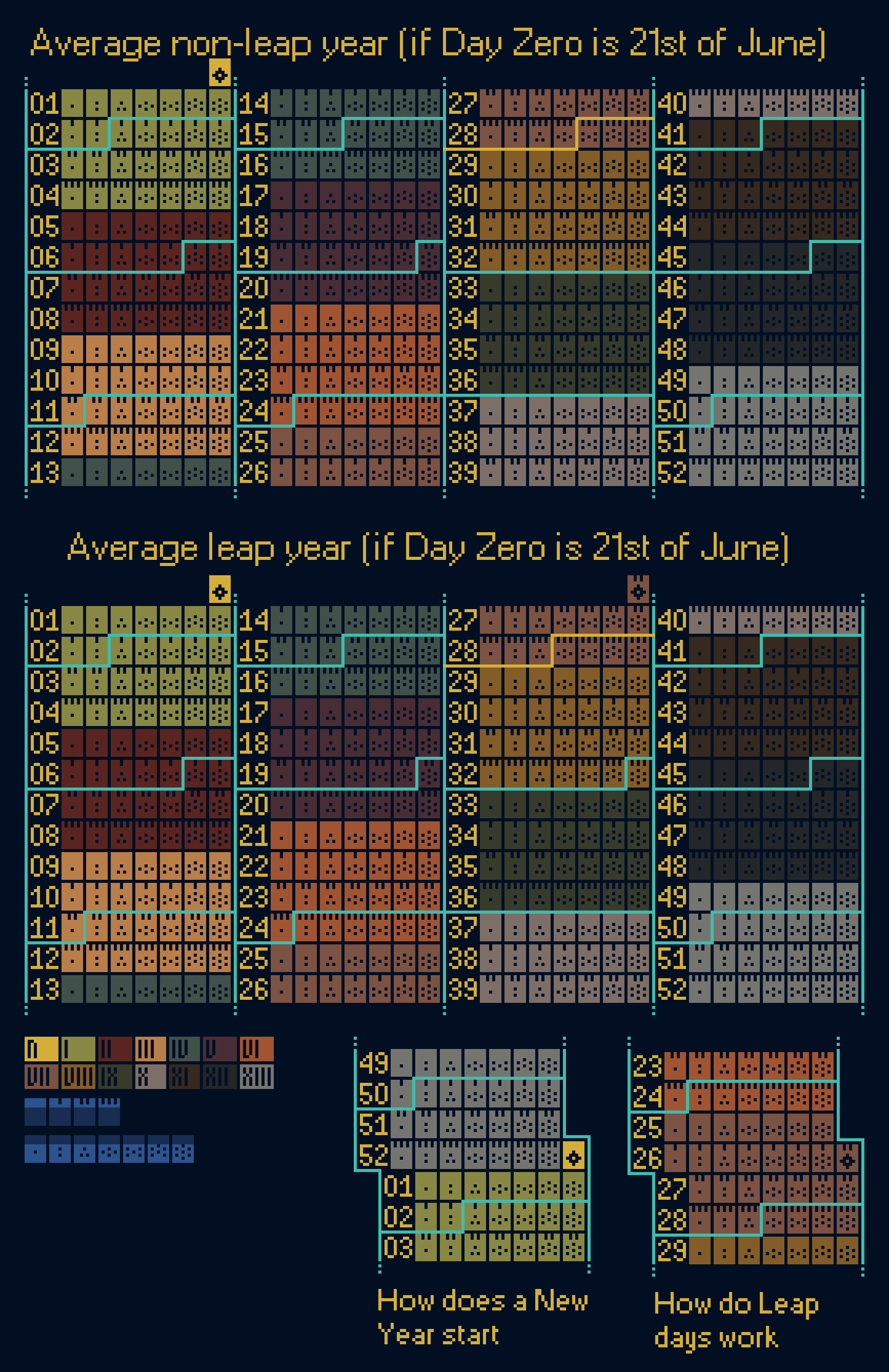 This is a calendar that is divided in a 13-28 way, that is, 364 of the 365 days are divided in 13 months, each with exactly 28 days, with the remaining day serving as New Year Day. (unlike many 13-28 calendars, this doesn't disrupt the weekday cycle, it still counts as a day of the week) It is designed so that the monthless New Year Day (or "Day Zero") falls in the Southern Winter Solstice (usually in 21st of June, as in the shown examples); and that the Leap Day is inserted in the middle of the year, falling in the Southern Summer Solstice (usually in 21st of December, as in the lower table). Leap years, however, because of astronomy, are not always necessarily every 4 years. The graphic notation is compact and easy to understand. Color indicates month, the upper edge indicates which quarter of the month, and the number of dots indicate the day of the month quarter. (the day of each month quarter does not necessarily always correspond to a specific day of the 7-day week cycle, because, again, neither the aforementioned Day Zero nor the Leap Day in the middle of the year disrupt the weekday cycle.) A special symbolis used to represent the solstices, whether it's the monthless Day Zero or the December Solstice Leap Day. The calendar graphs are also straight-forward: each "quarter-month" is numbered from 01 to 52 with golden numbers, and the divisions between the 12 Gregorian months are marked with turquoise lines except the December-January division, indicating a new Gregorian year, in which the line is golden (It is easy to know which Gregorian month is which, as the Tridecimal Month IX perfectly aligns with Gregorian February if it's a non-leap year in both calendars and Day Zero is in 21st of June). The calendar is also organized in four columns, which correspond to the four traditional seasons, from left to right: winter, spring, summer and autumn in the southern hemisphere (or summer, autumn, winter and spring in the northern hemisphere) This calendar and the Aymara calendar have a 5000 year difference. This calendar started in 21st of June, 1492, Proleptic Gregorian (which is equivalent to 12th of June, 1492 in the Julian calendar, the calendar used back then), while the Aymara calendar adds 5000 to the year number. For anyone curious, the subdivisions of the days are not hours, minutes or seconds, but instead into thousandths, and there are no timezones either: instead, 000 indicates midnight in 72 degrees west (or 80 gradians west, to remain consistent with the decimal-centred units)